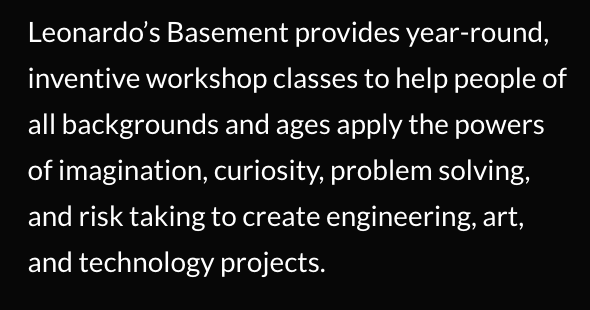 Leonardo's Basement is a one-of-a-kind creative learning environment. In our 11,000 square foot workshop, you'll find materials, tools, and classes to foster creativity and problem-solving. Kids learn self-confidence, cooperation, and experimentation. Adults learn new skills and rediscover curiosity and play.